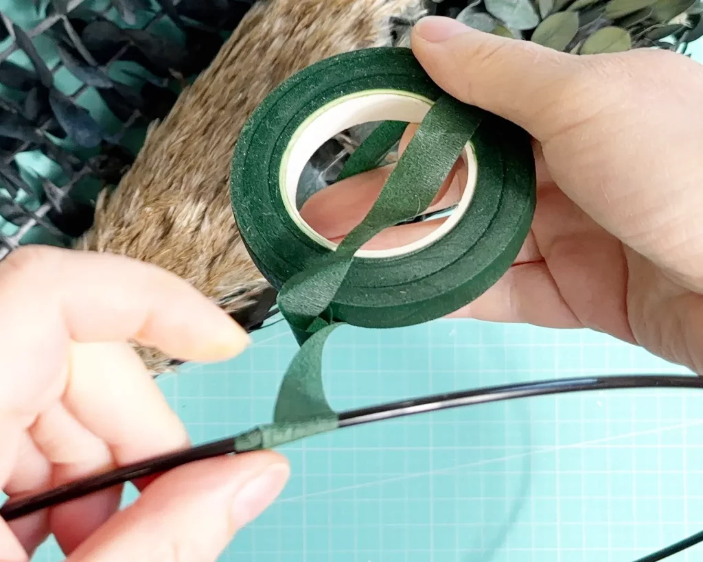 Lege dir Floristenband, Tannenzweige, Metallring und Basteldraht bereit. Binde zunächst das Floristentape um den Metallring. Du kannst ihn vollständig damit umfassen, oder anteilig, je nachdem ob du den Kranz nur teilweise oder vollständig mit Tanne bedecken willst.