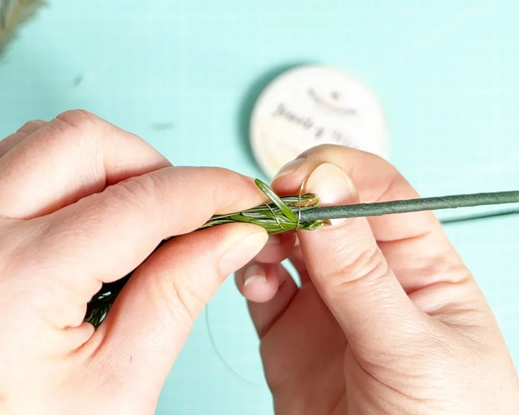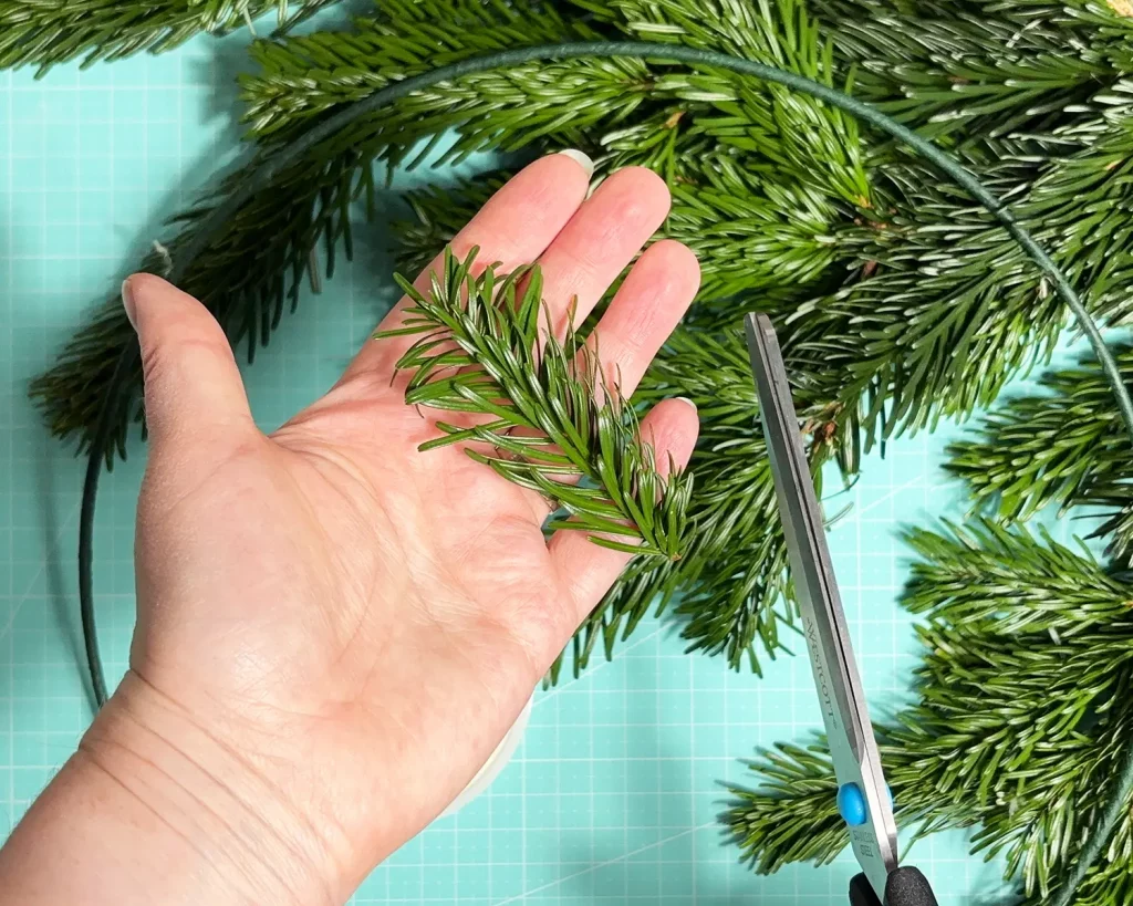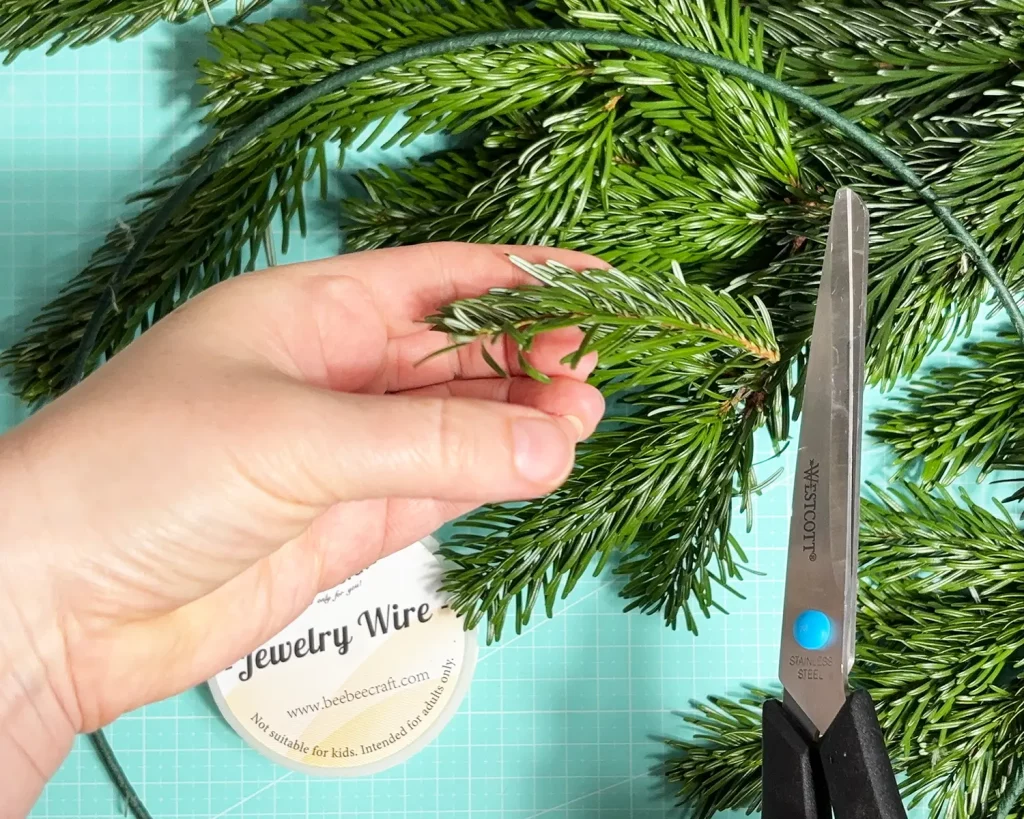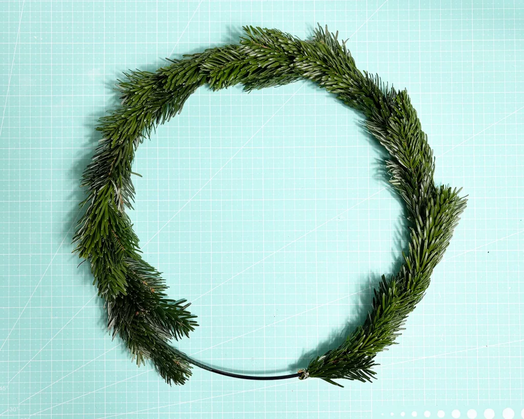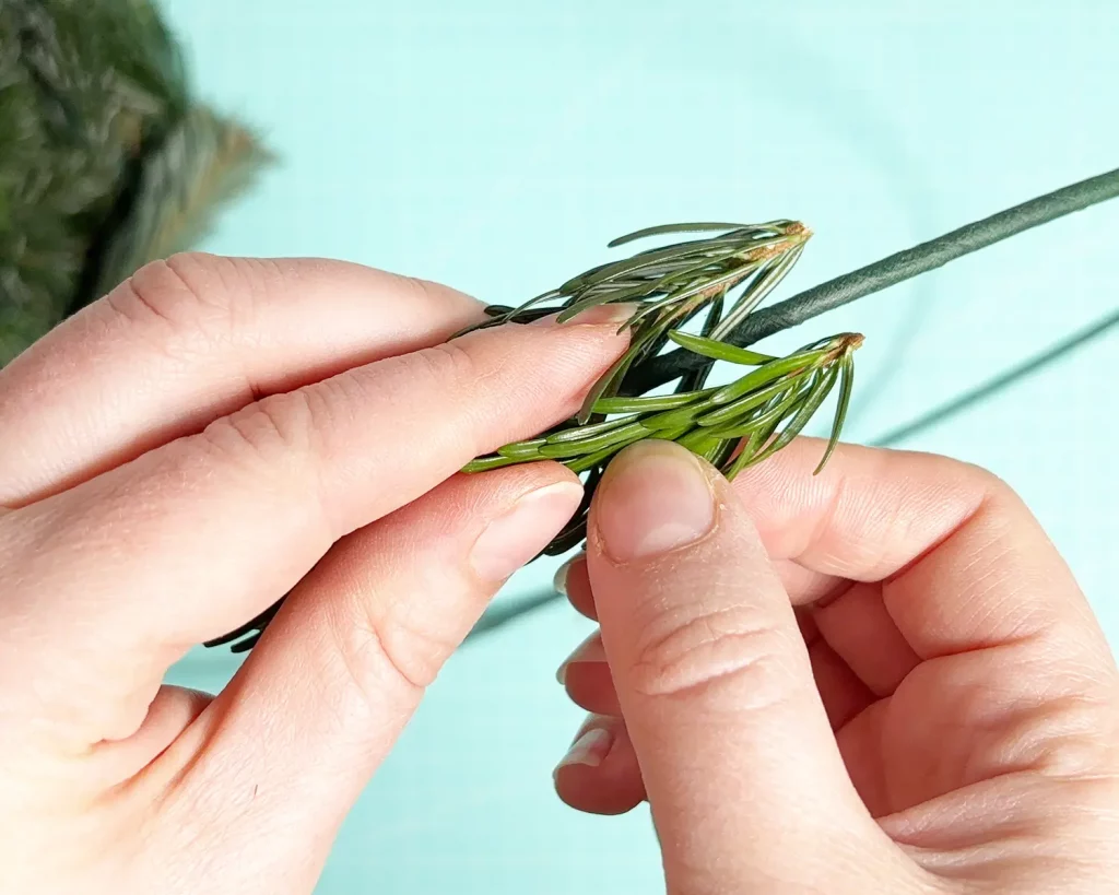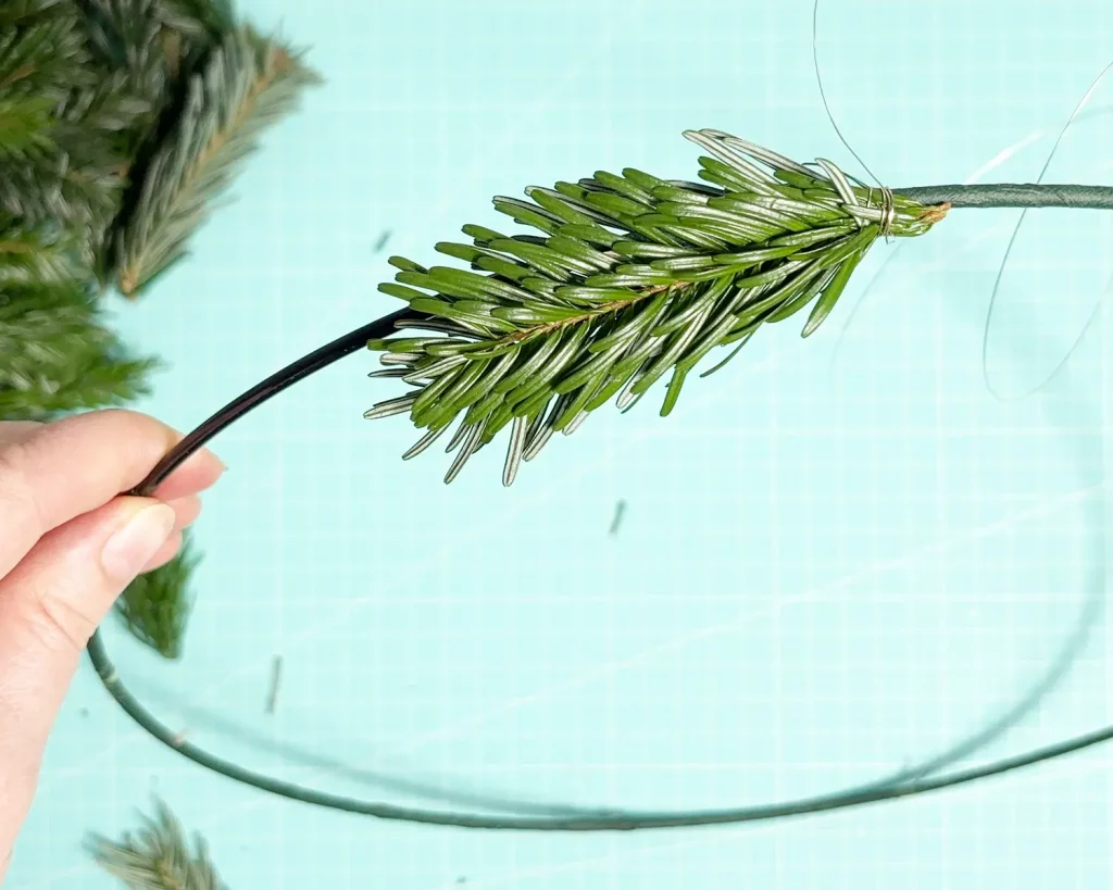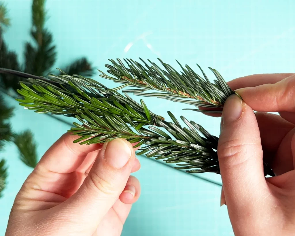 Lege dann je 2 (oder wenn dein Kranz voller aussehen soll 3) Tannenspitzen an den Metallring, wie abgebildet und befestige sie mit dem Basteldraht. Nimm ruhig etwas mehr Basteldraht, damit es gut hält. Und keine Sorge, man sieht den Draht später nicht mehr. Die nächste Schicht Tannenspitzen verdeckt den Draht.