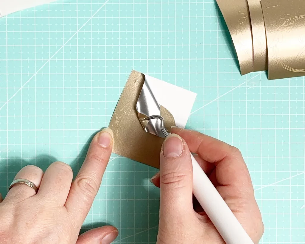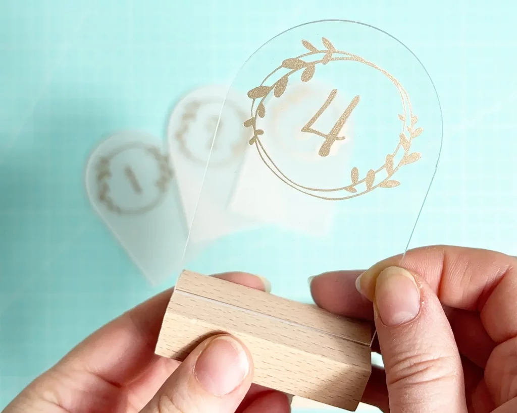Plottere dir die Zahlen, wie du magst. Ich habe auf eine Vorlage aus dem Cricut Design Space zugegriffen, geplottert und entgittert. Du kannst aber auch einfach schöne Rub-Ons kaufen oder sogar mit einem goldenen Marker auf die Acrylschilder malen. Lass deiner Kreativität freien Lauf! Wichtig: Ziehe zuerst die Schutzfolie von einer Seite der Acrylschilder. Wenn du dich für