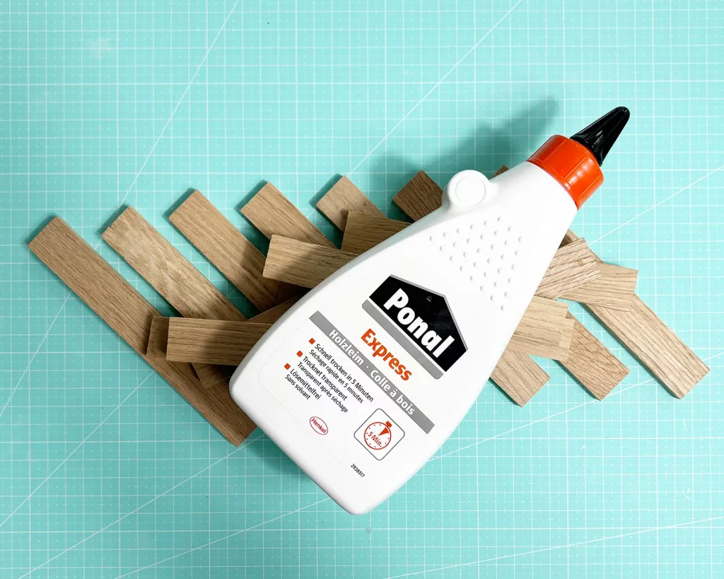 Leime immer je 2 Klötzchen an der kurzen Seite zusammen. Leime die so entstandenen Klötzchenleisten flach an der Längsseite zusammen, so dass 5 Reihen Klötzchen aneinander liegen. Das wird deine Basis.