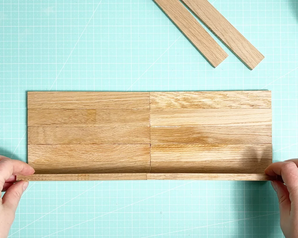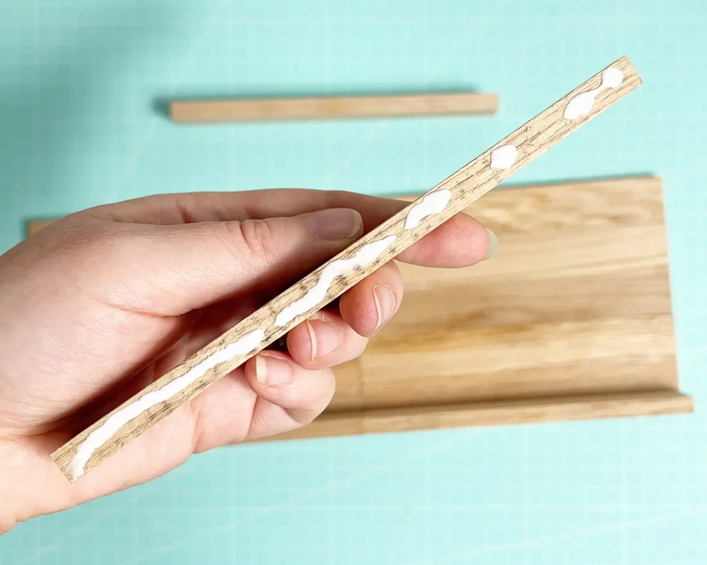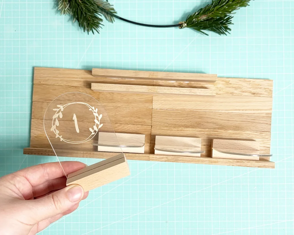 Leime eine weitere Klötzchenleiste vorne auf deine Basis. Das ist die Blende, die später die Ständer deiner Acrylschilder verdeckt. Klebe dann 2 Klötzchen mit ein bisschen Abstand mittig in den hinteren Teil deiner Basis. Hier wird später dein Kranz eingesetzt. Ich habe mich etwas verschätzt bei der Größe und musste den Kranz später noch ankleben. Wenn du ihn nur stecken willst, verringere den Abstand zwischen den Klötzchen.