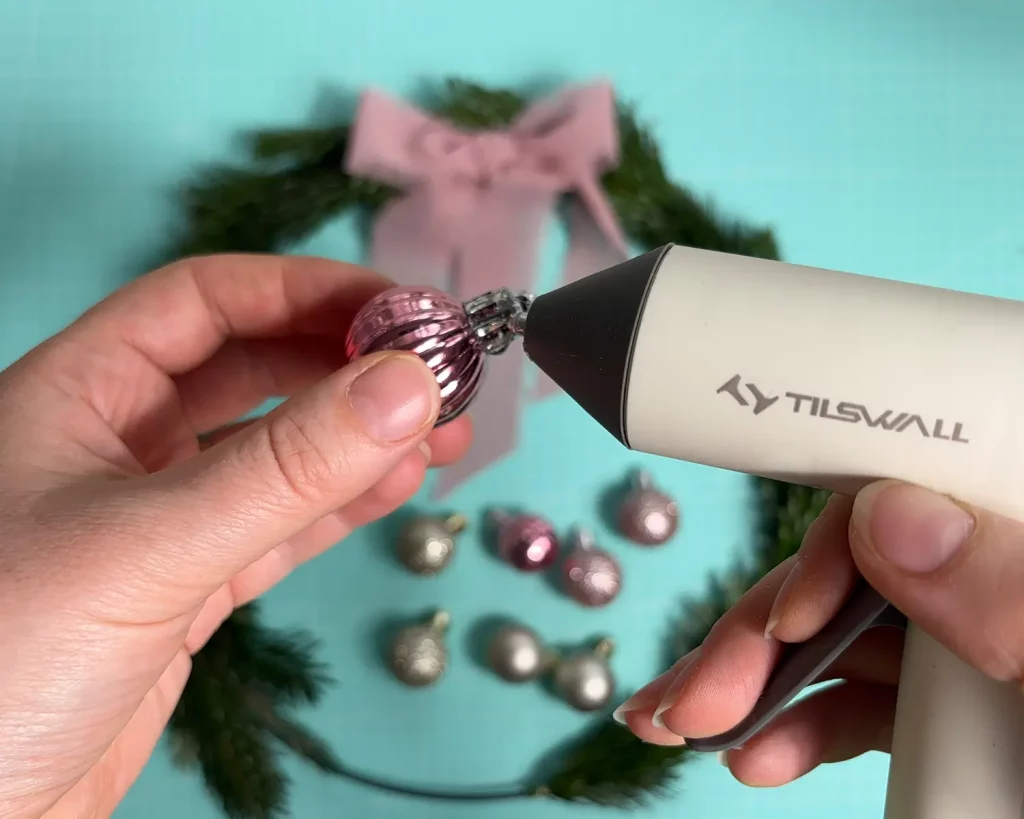 Dann kannst du den Kranz nach deinem Geschmack verschönern. Nutze, was dir gefällt. Ich habe mich für rosa und goldene Mini-Christbaumkugeln entschieden. Aber du kannst natürlich nehmen, was du magst. Auch Nelken, Zimtstangen, Orangenscheiben, Tannenzapfen und Pompoms eignen sich prima, um deinem Kranz einen individuellen Look zu geben. Tob dich aus. 🙂